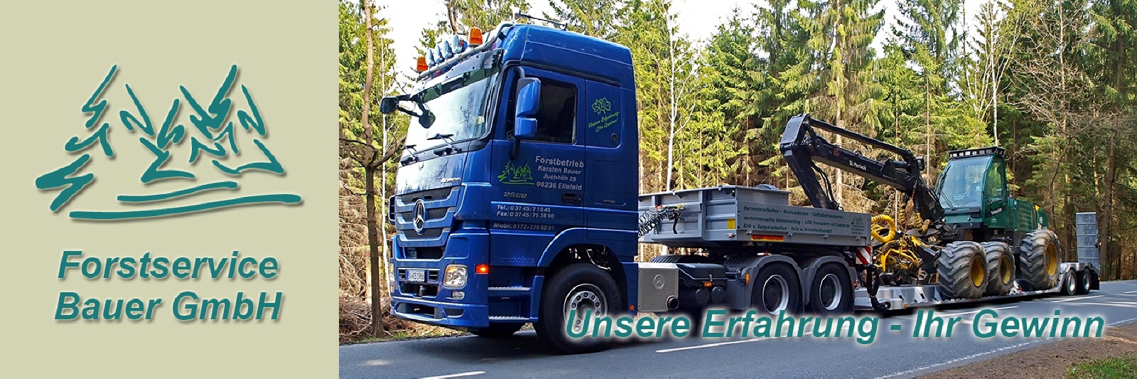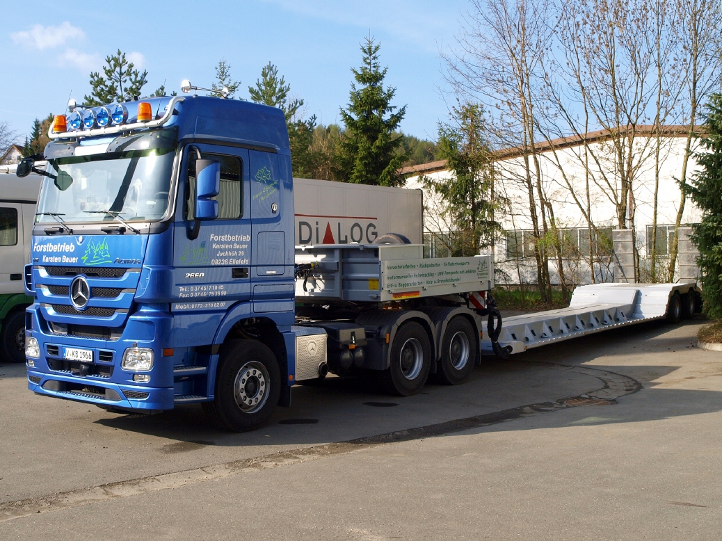 Zum Transport von Bau- und Forstmaschinen innerhalb Deutschlands steht ein moderner, leistungsstarker LKW mit Spezialtieflader mit absenkbaren Schwanenhals bereit.