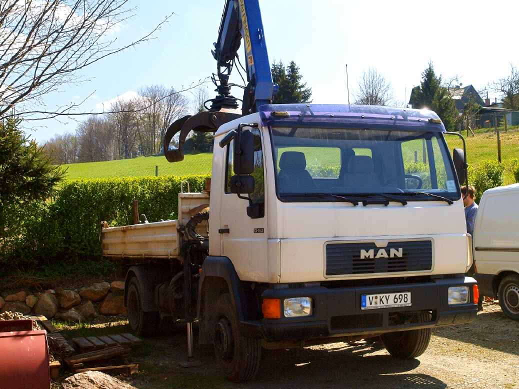 Für Schütt- und Stückgut steht ein 3-Seitenkipper mit Ladekran, Nutzlast 5 t, zur Verfügung. Der Ladekran ist verfügbar mit Ladeschaufel für Schüttgut, Holzgreifer oder Lasthaken.